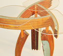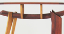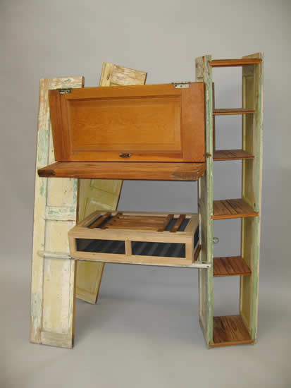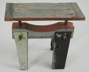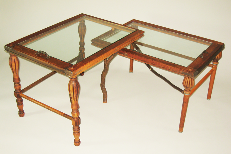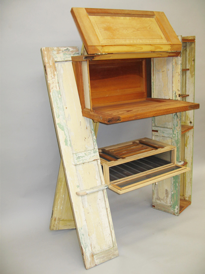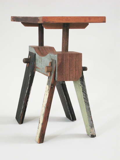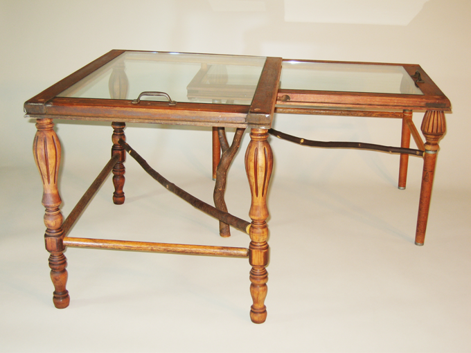 This piece explores a variety of materials spanning the progression of wood from branches to simple broomsticks and pressed wood fiber, to elaborate turned legs, and incorporation of other materials such as glass and metal window hardware. The third frame created by the overlapping window frames suggests the creation of new vistas derived from the intersection of used materials in new construction.