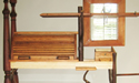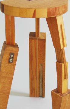 The entrance hall is a space of entering and of leaving, of preparing and of returning. The Hall Monitor assists with the physical and psychological readiness for crossing the threshold. It uses materials reflecting the stages of wood use, like the stages of life, from tree limbs to turned bedposts. Like an old, musty butler, cobbled together from vestiges of storied pasts, it none-the-less proposes Socrates scrutiny: Does this mosaic constitute an examined life?