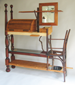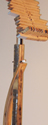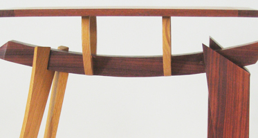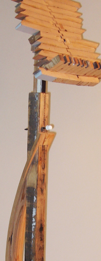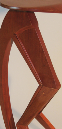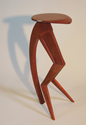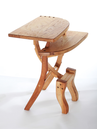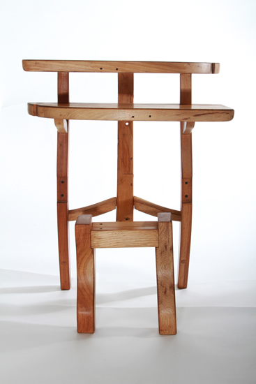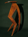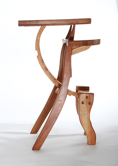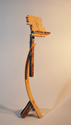 Music stands have long been a traditional craft form, a part perhaps of the enduring rapport between instrument craft and musical performance. This stand attempts to allude to the many curves in music: the clef, the bow, the string instruments, as well as, in the music desk, the musical staff. The height adjustment stop is from a door hinge.