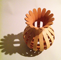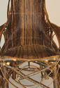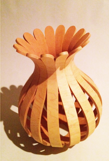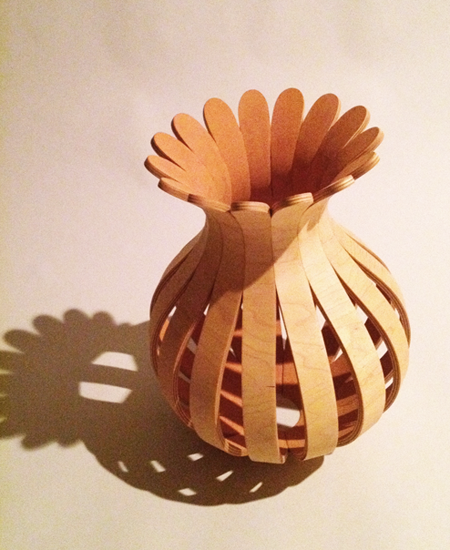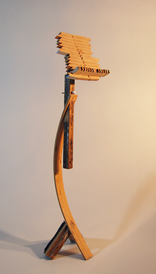 This vessel, pierced by light, was constructed using bent lamination followed by coopering, a traditional barrel-making process. It leans slightly to suggest the rays of sunlight that angle down through clouds. It casts an alternating pattern of shadow and light.