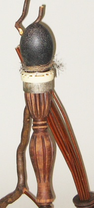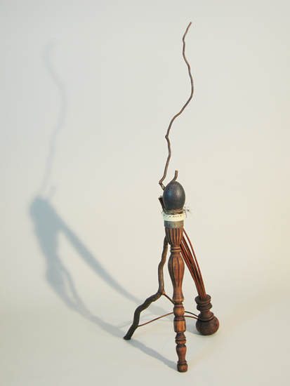 This reliquary evokes an honored individual and the multiple elements that make up a life. Like the bird’s nest, the supporting structure is constructed from natural and man-made materials. The large turned ball-like foot, from a bedpost, suggests the history from which multiple strands rise up to support the stage for this person’s life. The turned leg holding the nest evokes the careful craft of a life’s work of self-definition. The natural branch, with its many abandoned branches and dead ends, its twists and turns, tries to bury the dichotomy: Is it fate or choice?