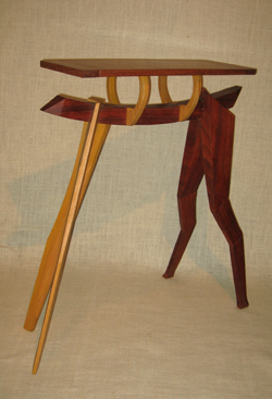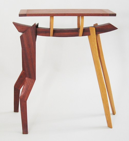 (see Simian Side Table). This piece is out of “new” wood, wood without a utilitarian history, rather coming from a living history and a harvesting/economic story. In giving an animal form to the piece I tried to evoke both Piaget’s animism and spiritual animism. The long legs and playful form suggest the young spring litter of the forest.