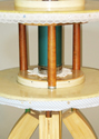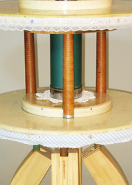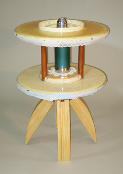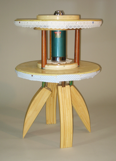 The tea table is a traditional hub of social exchange. The industrial wire spool ends used to make this table represent another conveyance of social exchange: telephone wire. While the cables are less and less essential to communication, the social centrality of gathering for food and drink remains. The spools are dismantled and dressed for Tea with lace and Gingham, and a spoonful of ugliness.