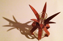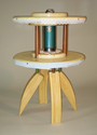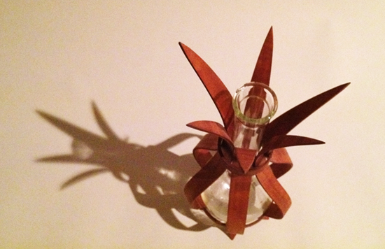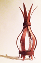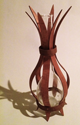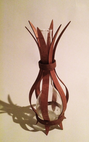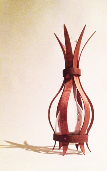 This piece is made from a used glass scientific volumetric flask within bent wood lamination as support and protection. The stamen-like flask neck and radiating points reminded me of a tulip rising from its bulb. This piece sits in a beautiful setting in a private home.