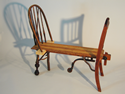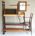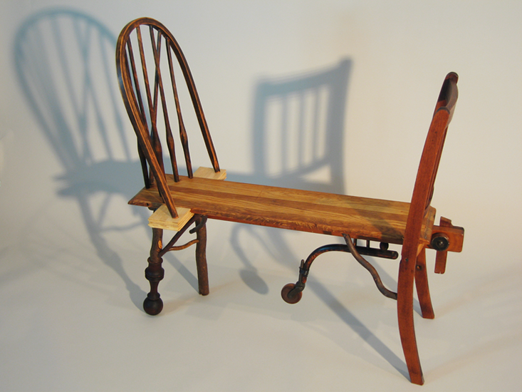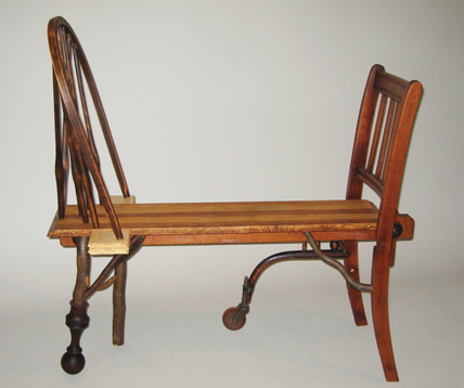 This piece has two chair backs facing each other linked by a leaf of a dining room table. The chair backs are too close for two people to sit comfortably together unless they allow for some cooperation or intimacy. They are necessarily in each others’ space. The wheel dangles amidst four stationary legs, somewhat provocatively, offering the element of movement, of work, and of progress. Is this a space of splitting or sharing, reconnoitering or redemption?