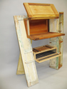 Drawing inspiration from the traditional pie safe, this piece looks at first a bit off kilter. Odd angles, open and closed spaces, alert one that this temple of the totem of Americana, the pie, is evolving. Grounded in tradition, thematically, and physically through the use of recycled wood, the (re)construction of this piece suggests a phylogenic new “safe”, an evolving and inclusive repository of cultural identity.
